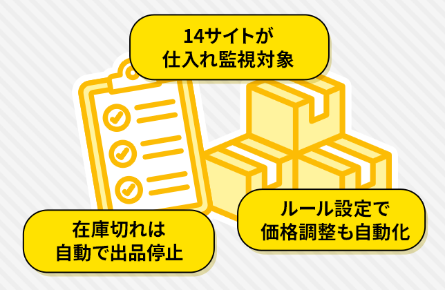 仕入れ元サイトから商品情報をトラッキングが可能です。これによりタイムリーにデータが取得できるため、在庫切れのリスクや価格変動による赤字リスクを無くすことができます。