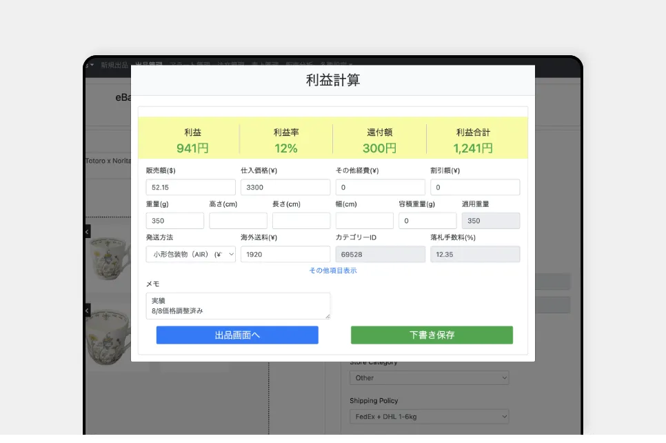 • 仕入れ価格と販売価格から商品ごとの利益を自動算出が可能
